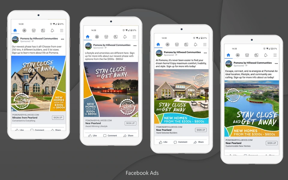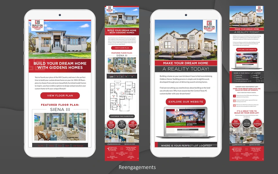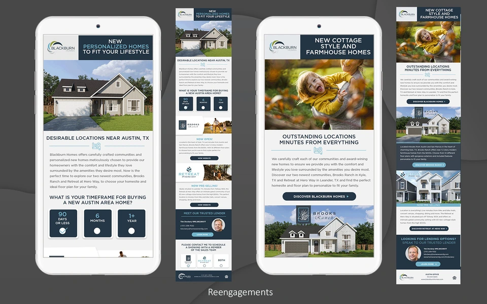 We focus on the buyer journey, ensuring your marketing content and assets align to how your home buyers engage with your brand to deliver a customized home buying experience while increasing overall conversions. We accomplish this by optimizing landing pages, website UX, UI, social sites, digital campaigns, and more. Each asset is aligned to fully engage the buyer with what our home builder and developer clients offer.