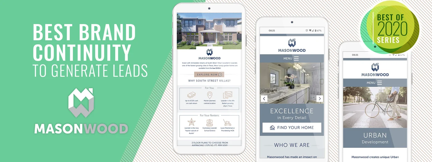 The countdown is on for the final three from our favorite 2020 success stories that showcase our creative energy at work, helping our home builder and real estate clients meet the demands of the ever‑changing market dynamics to sell more homes. This week, we spotlight Austin, TX home builder, Masonwood’s brand continuity project from our Best of 2020 list.
