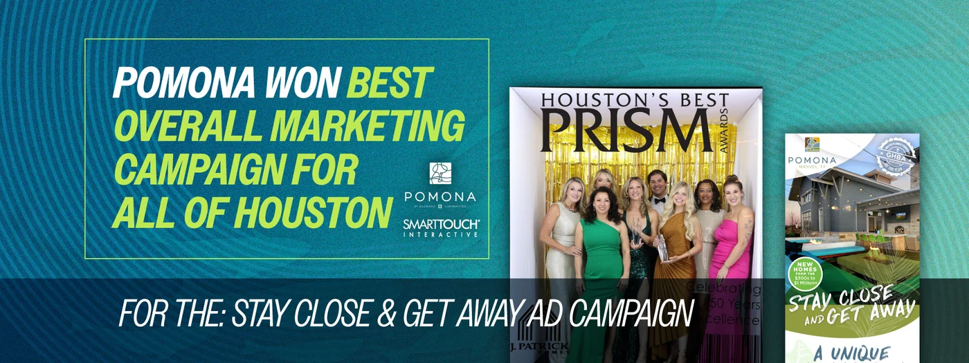 SmartTouch® Interactive, an award‑winning interactive real estate marketing agency, real estate marketing automation, and lead nurturing CRM solution company is proud to announce that Pomona by Hillwood was awarded a Houston’s Best PRISM Award from the Sales and Marketing Council of the Greater Houston Builders Association. Pomona received the honor of Best Overall Marketing Campaign for the Stay Close & Get Away Ad Campaign at the PRISM awards 50th anniversary.