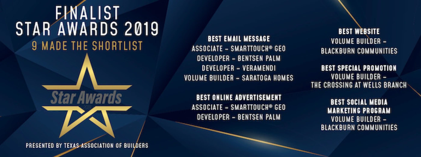 Austin, TX – May 28, 2019 – SmartTouch® Interactive, a full‑service real estate marketing agency, real estate marketing automation and lead nurturing CRM solution company, announces their 9 finalist positions for the 26thanniversary of the Texas Association of Builders (TAB) Star Awards. Following the Sunbelt Builders Show the awards ceremony will take place Thursday, August 8thfrom 6:00‑8:30 p.m. at the Gaylord Texan in Grapevine, Texas.