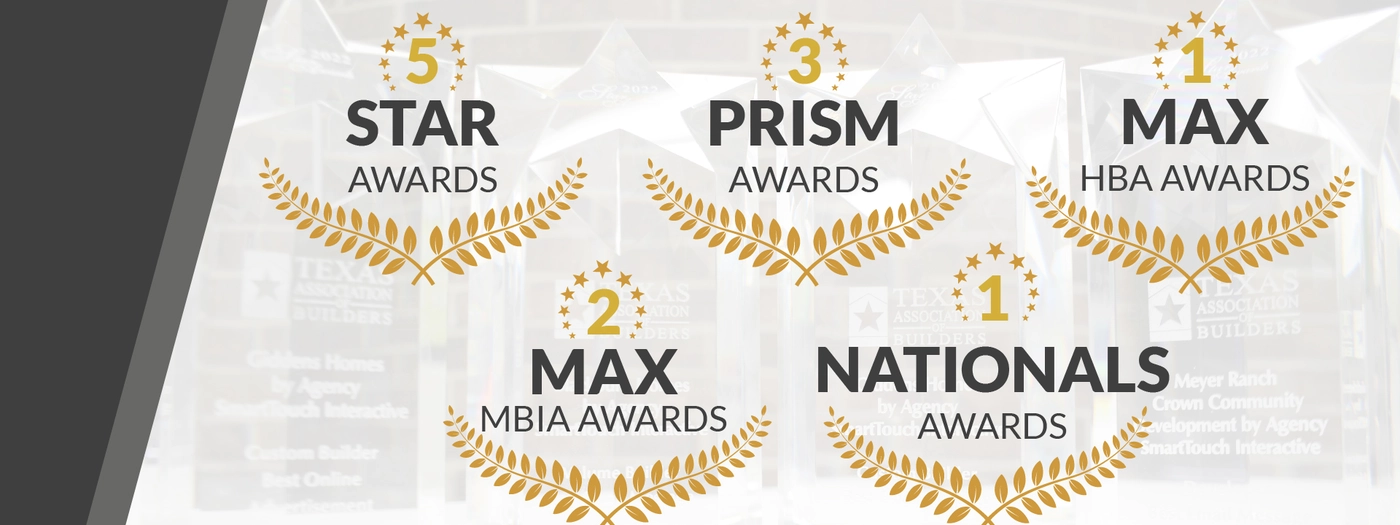 Austin, TX – August 9, 2022 – SmartTouch® Interactive, an award‑winning interactive real estate marketing agency, new home sales CRM, and marketing automation solution provider, announced that it received 12 new marketing awards from national and regional home builder associations and marketing associations, including Prism Awards, MAX Awards from Maryland Building Industry Association, MAX Awards from the Home Builders Association of Greater Austin, STAR Awards from Texas Association of Builders and Nationals from the National Association of Home Builders.