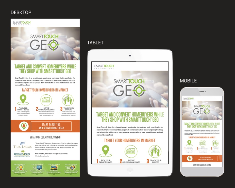 Our team’s innovation in lead generation and digital marketing support home builders and residential developers in meeting their goals year over year. Setting a new standard, we are a single‑solution digital marketing provider solving the need for proven lead generation programs; a lead nurturing CRM/Marketing Automation platform, SmartTouch® NexGen; and a cutting‑edge homebuyer geofencing solution, SmartTouch® Geo.