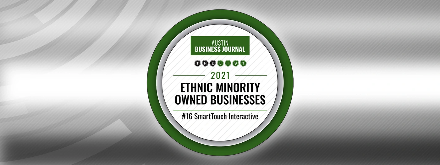 It is our great privilege to announce for four consecutive years, SmartTouch® Interactive has been honored by Austin Business Journal (ABJ) as one of the Top Austin area ethnic minority‑owned businesses. This year the company was ranked #16 among the Top 25 minority owned companies, which are eligible based on revenue in 2020 and have at least a 51 percent ethnic minority ownership and company headquarters based in Austin, TX. In the prior year, SmartTouch® was ranked #20.