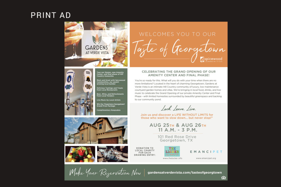 The Taste of Georgetown was the name given to Garden at Verde Vista’s grand opening of their final phase and new amenity center. The event gave attendees a “taste” of the Gardens of Verde Vista (GVV) lifestyle with home and amenity tours while also literally giving them a taste of local food and drinks and live music from local artists. It was very important to portray GVV as an intimate community connected to the City of Georgetown.